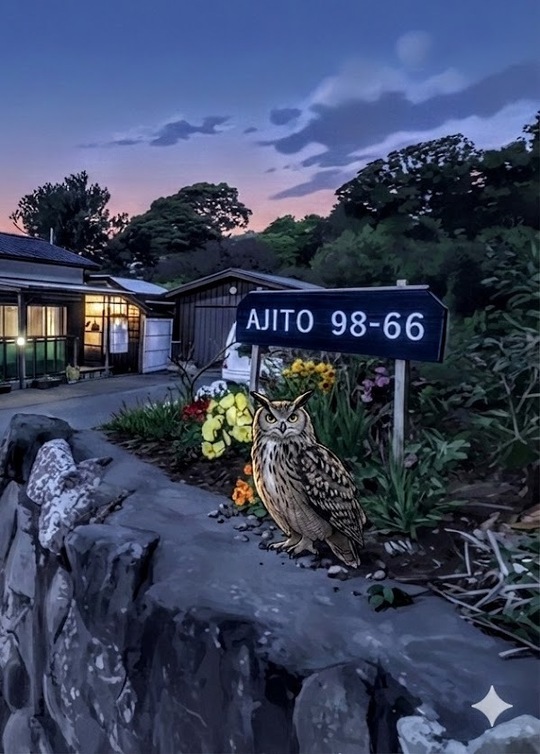 ⑩ 狭い登り坂。左手に青い看板 AJITO